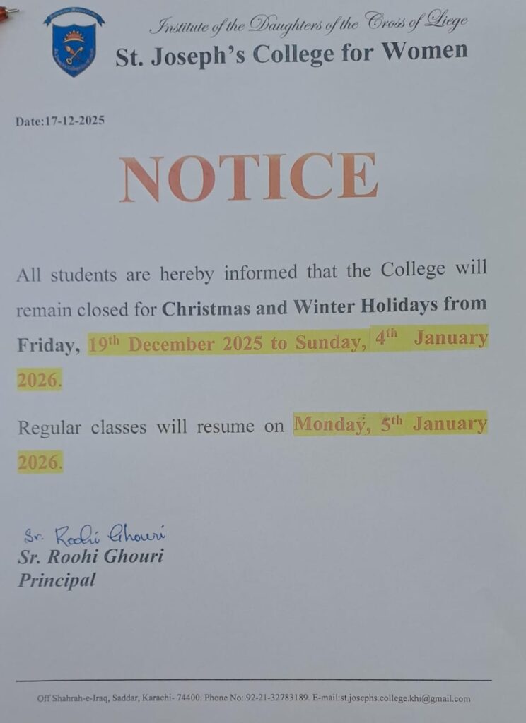 All students are hereby informed that the College will remain closed for Christmas and Winter Holidays from 19 December, 2025 to 4 January, 2026.